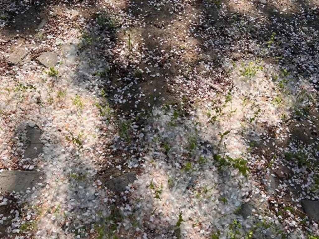 北京一小区内掉落的花瓣被飞絮包裹。资料图片 刘颖琪摄