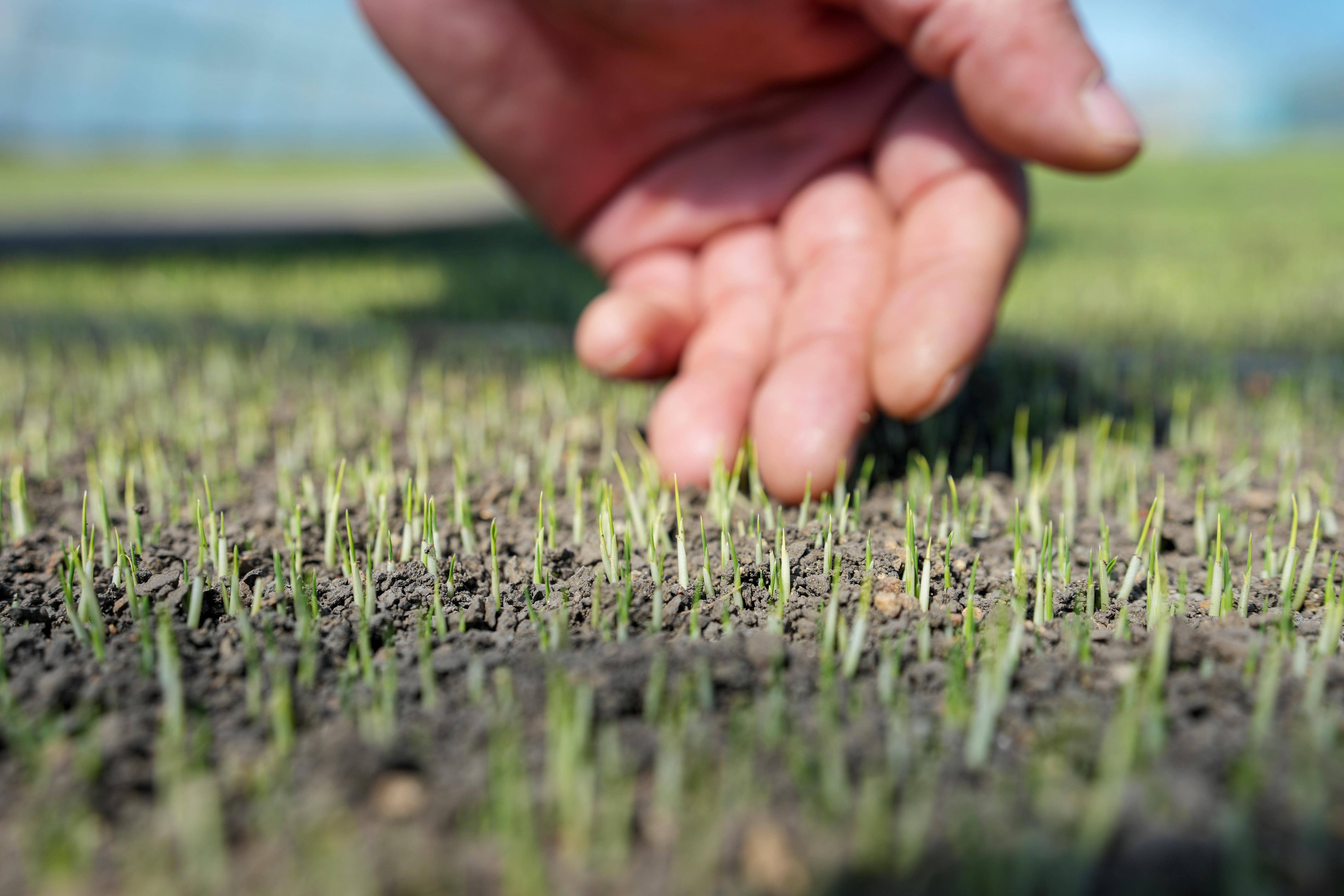 在黑龙江省双鸭山市的黑龙江北大荒农业股份有限公司友谊分公司第三管理区水稻育秧大棚中,农户在查看稻苗长势(4月9日摄)。