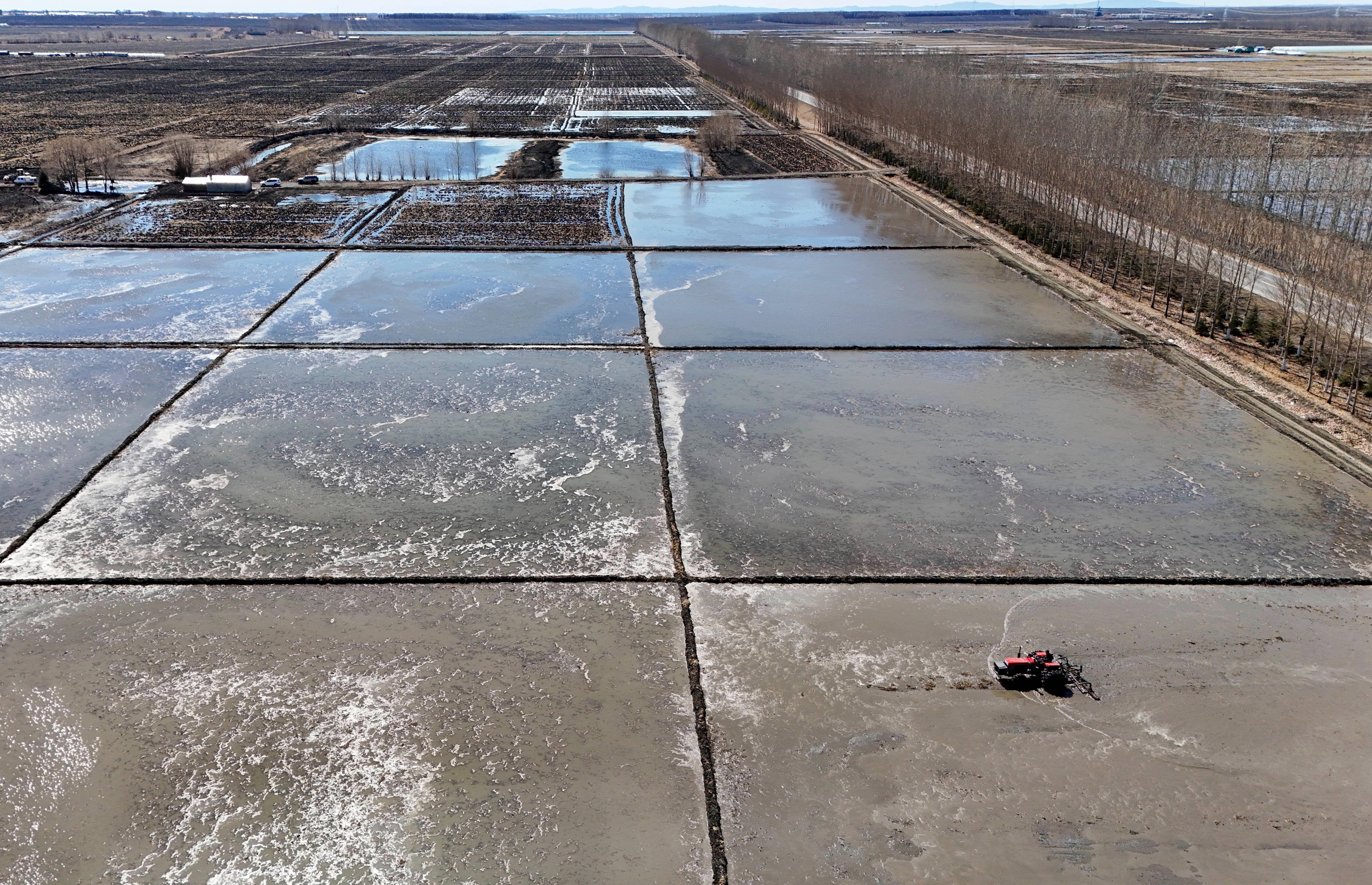 这是4月9日拍摄的黑龙江北大荒农业股份有限公司友谊分公司水稻田整地作业现场(无人机照片)。在位于三江平原腹地黑龙江省双鸭山市的黑龙江北大荒农业股份有限公司友谊分公司,水稻大棚集中育秧工作高效推进,大面积稻田整地作业有序展开。