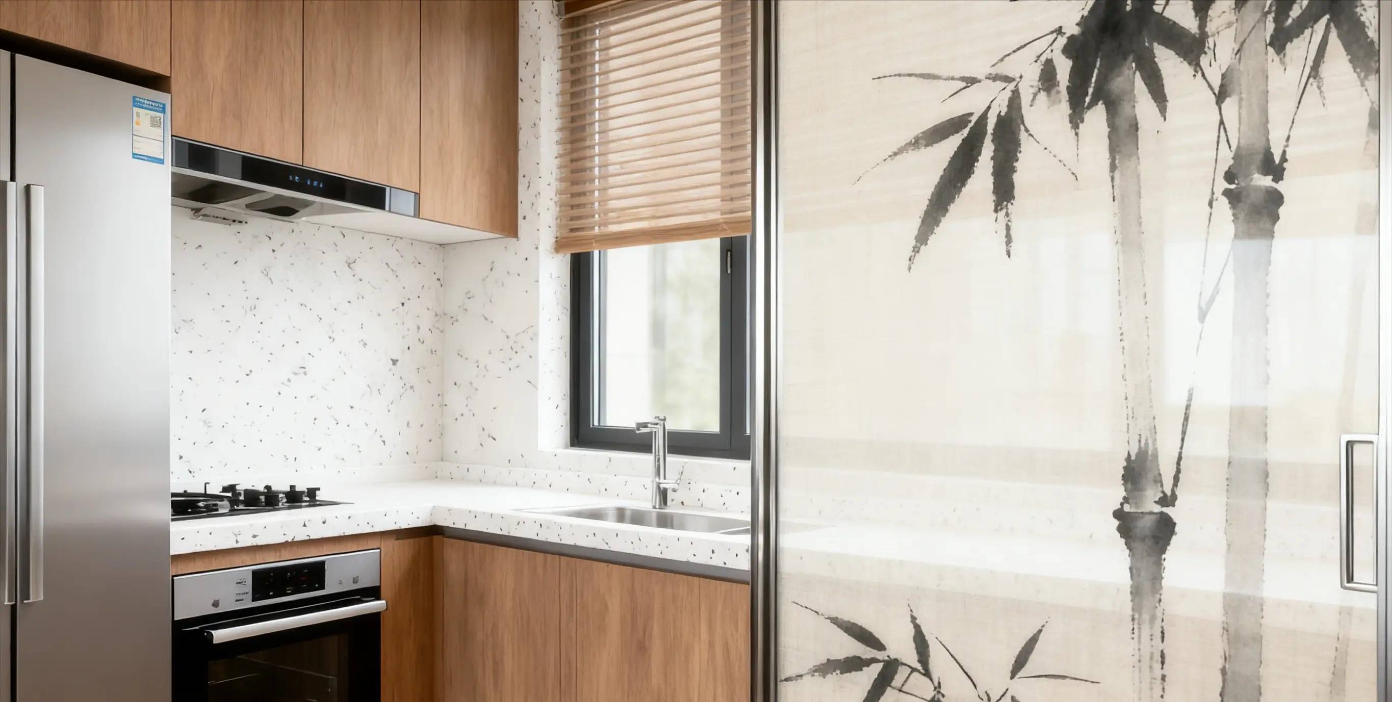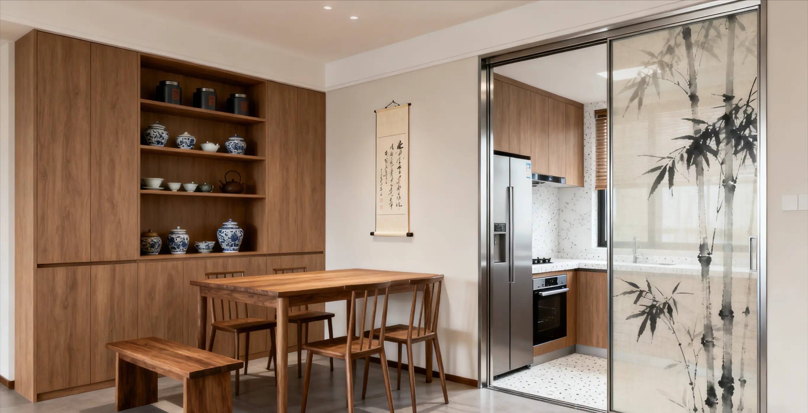 85㎡户型大多是餐厨相连,采用半开放式布局,用窄边金属+玻璃推拉门分隔厨房与餐厅,关上门可隔绝油烟,打开后能实现视觉通透,玻璃上可印制水墨竹影图案,增添中式韵味。
