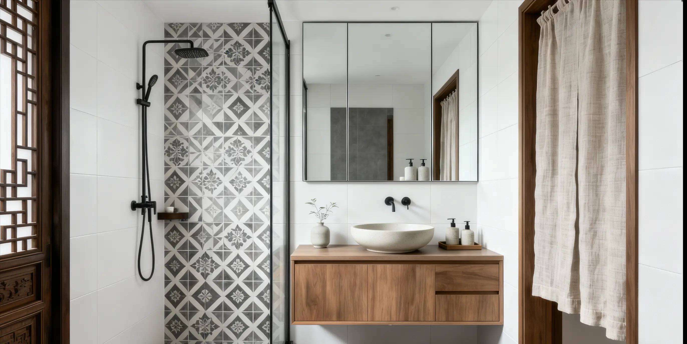 卫生间以灰白为主色调,通过材质与细节营造中式韵味。墙面铺贴白色哑光砖,淋浴区用几何图案花砖点缀,避免空间呆板;浴室柜选择浅木色悬空款,搭配圆形陶瓷台盆,呼应中式经典造型;镜柜采用无框设计,增加收纳空间的同时,保持视觉简洁。细节处可放置陶瓷洗漱用品套装,并悬挂棉麻浴帘,提升整体质感。