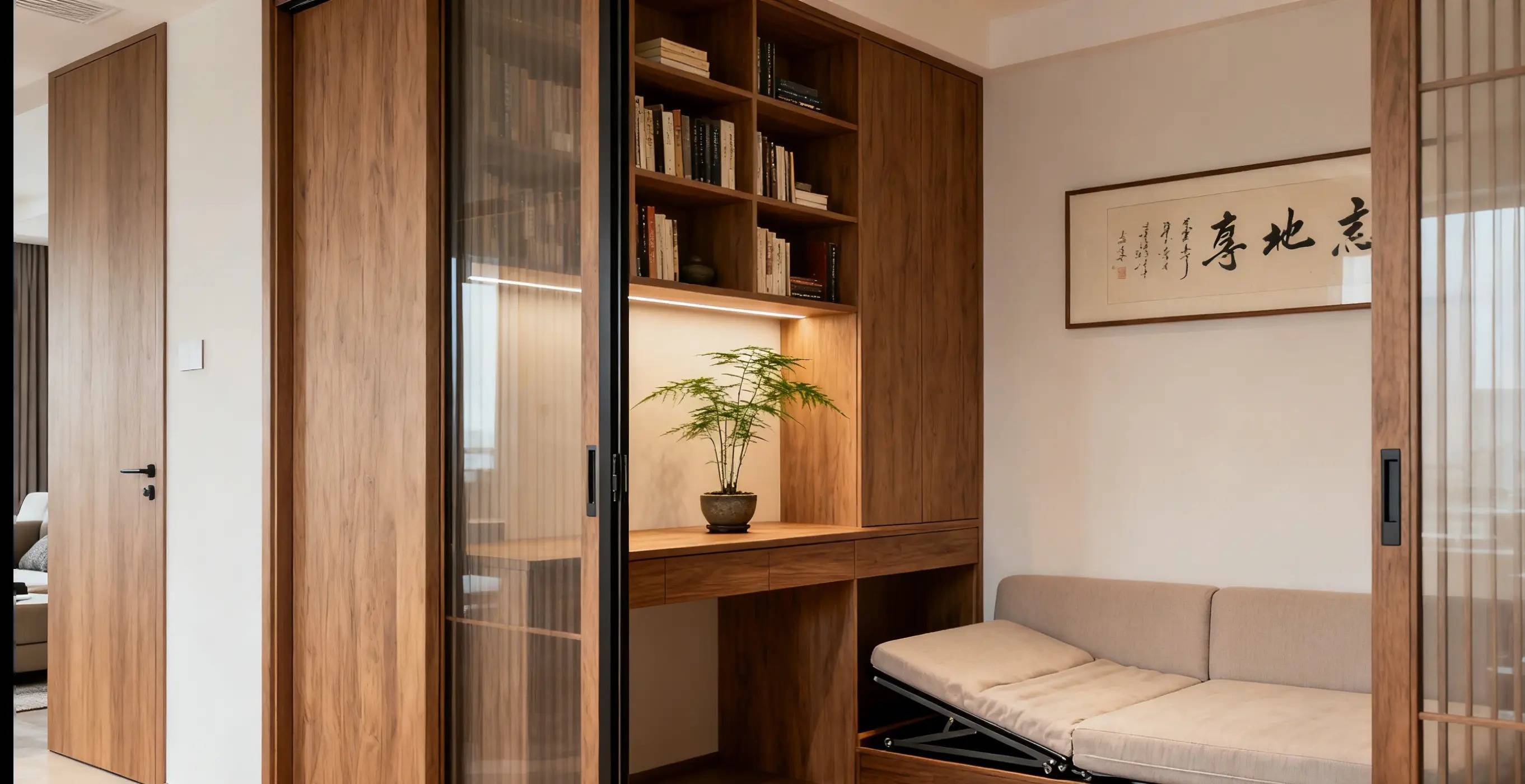 85㎡的书房空间有限,要兼顾办公、阅读与临时客房需求。用推拉门替代实体墙,拉门关闭时形成独立空间,打开后与主卧或客厅连通,增强空间流通性。定制到顶书架与书桌一体化设计,书架选用浅胡桃木色,书桌嵌入其中,节省空间;墙面悬挂简约书法作品,摆放一盆文竹,营造浓厚书香氛围。若需兼顾客房功能,可选择折叠沙发床,平时收起不占空间,客人来访时展开使用。
