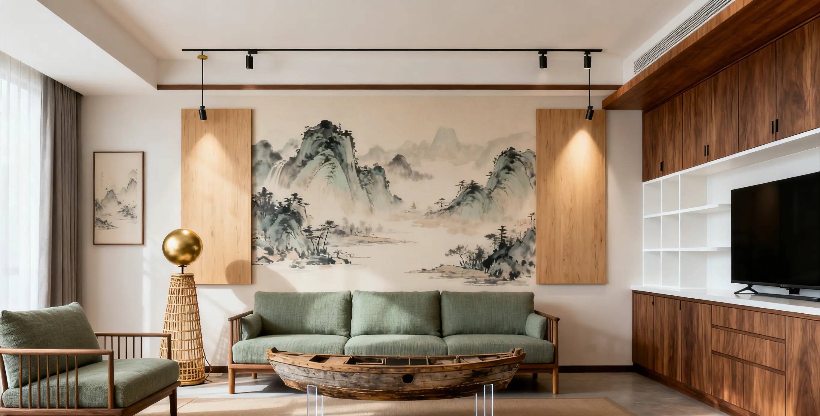 客厅是家庭的核心区域,既要满足待客需求,又要兼顾日常休闲,设计的关键在于“对称平衡+视觉延伸”。布局上采用中式经典对称法:沙发背景墙以一幅写意山水画为中心,两侧对称安装浅木色装饰板,下方搭配细腿实木沙发,选择灰绿色棉麻面料,中和木质的厚重感;茶几选用老船木材质搭配亚克力细腿,既保留中式质感,又减轻视觉重量,方便扫地机器人通行。