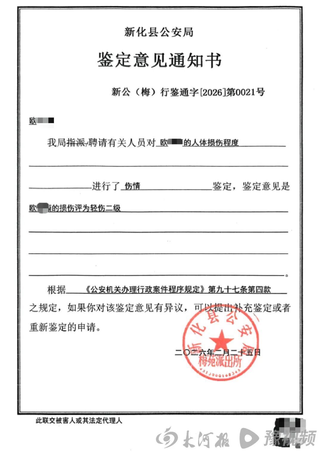 2026年2月,新化县公安局对欧女士进行伤情鉴定,鉴定为轻伤二级。3月17日,警方将该案立为刑事案件。