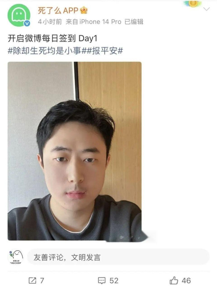 15日,“死了么”App账号发帖称,开启微博每日签到Day1,并附上“除却生死均是小事”“报平安”的话题,配了一张自拍照。另外,记者发现,“死了么”创始人吕先生的微信昵称增加了“决定公开露面”。