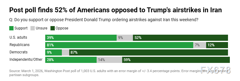 华盛顿邮报于2026年3月1日通过短信方式进行的民调,针对1003名美国成年人的样本,误差幅度为正负3.4个百分点。该调查显示,52%的受访者明确反对总统唐纳德·特朗普在上周末下令对伊朗实施空袭,仅有39%表示支持,另有9%持不确定态度。更值得注意的是,强烈反对的比例高达39%,远高于强烈支持的22%,这表明反对情绪的强度更胜一筹。从党派角度来看,几乎九成的民主党人和约六成的独立选民对这些打击行动持否定立场,而共和党人中则有约八成表示支持。这种党派分化进一步延伸到人口统计学特征:女性群体以26个百分点的显著差距反对空袭,而男性意见则较为均衡;年轻美国人同样更倾向于反对,反映出代际差异在外交政策上的体现。