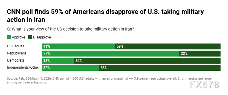 CNN于2026年2月28日至3月1日通过短信进行的民调,样本涵盖1004名美国成年人,误差幅度为正负3.9个百分点。该调查发现,59%的美国人不赞成美国对伊朗采取军事行动,这一比例与2025年6月特朗普政府上次轰炸伊朗时的56%不赞成率相近,表明公众态度的一贯性。强烈不赞成的比例为31%,超过强烈赞成的16%,进一步凸显了负面情绪的主导地位。民调结果的细微差异可能源于问题措辞的变异,以及事件发生后民众意见形成的动态过程。