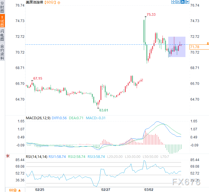 周二亚市时段,美原油价格震荡上行,现交投于每桶72.42美元附近,日内涨幅约1.6%。目前,价格走势反映出市场正在等待进一步明确上涨的信号。在1小时图表上,美原油正在区间内盘整,若要实现大幅上涨,可能需要更广泛升级的确认;而若出现跌出区间的迹象,则可能导致部分已嵌入的风险溢价消退。在此之前,价格似乎倾向于在约70至73美元之间的短期区间内交易。
