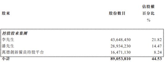 目前,34岁的李志晨担任公司董事会主席、执行董事及首席执行官,37岁的潘阳担任执行董事兼首席技术官。截至招股书披露日,李志晨直接持有公司21.82%的股份,并通过其控制的员工持股平台(万德创新)持有8.24%的股份;潘阳持有14.47%的股份。两人签署了一致行动协议,李志晨合计控制公司约44.53%的持股权益及投票权。