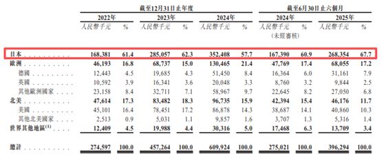 记者注意到,卧安机器人的主营业务具有鲜明的“出海”特征。2022年~2024年和2025年上半年(以下简称报告期),公司来自日本、欧洲及北美市场的合计收入占总营收的比例分别为95.5%、95.6%、95.0%及96.6%。